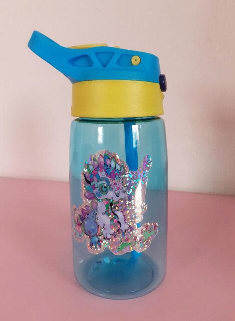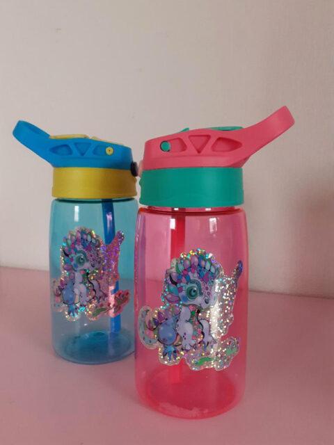 Süße Trinkflasche für Kinder mit glitzernden Motiven.