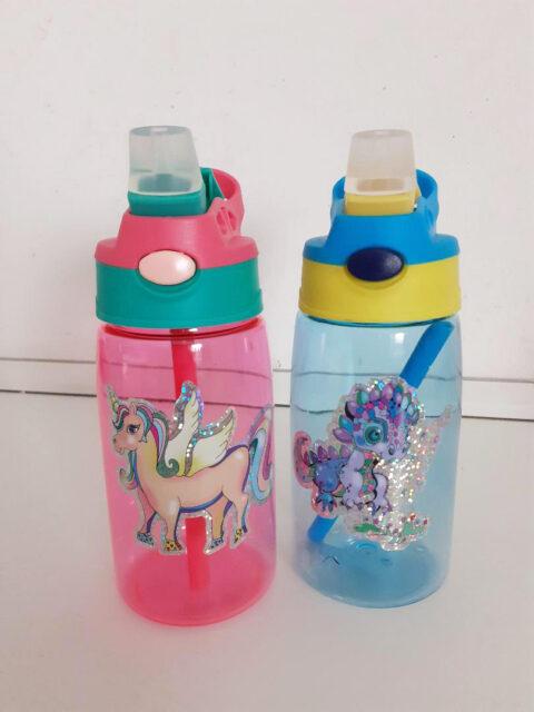 Süße Trinkflasche für Kinder mit glitzernden Motiven.